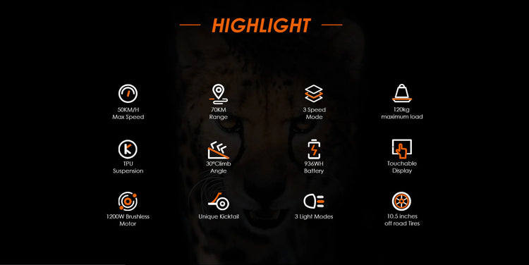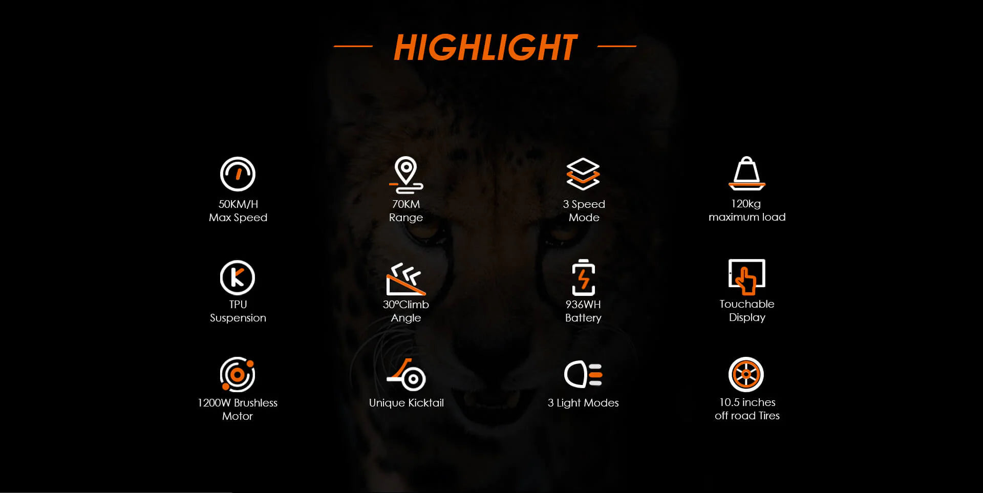 | Range | 60 Km/37 Miles | Battery | 52V 18Ah |